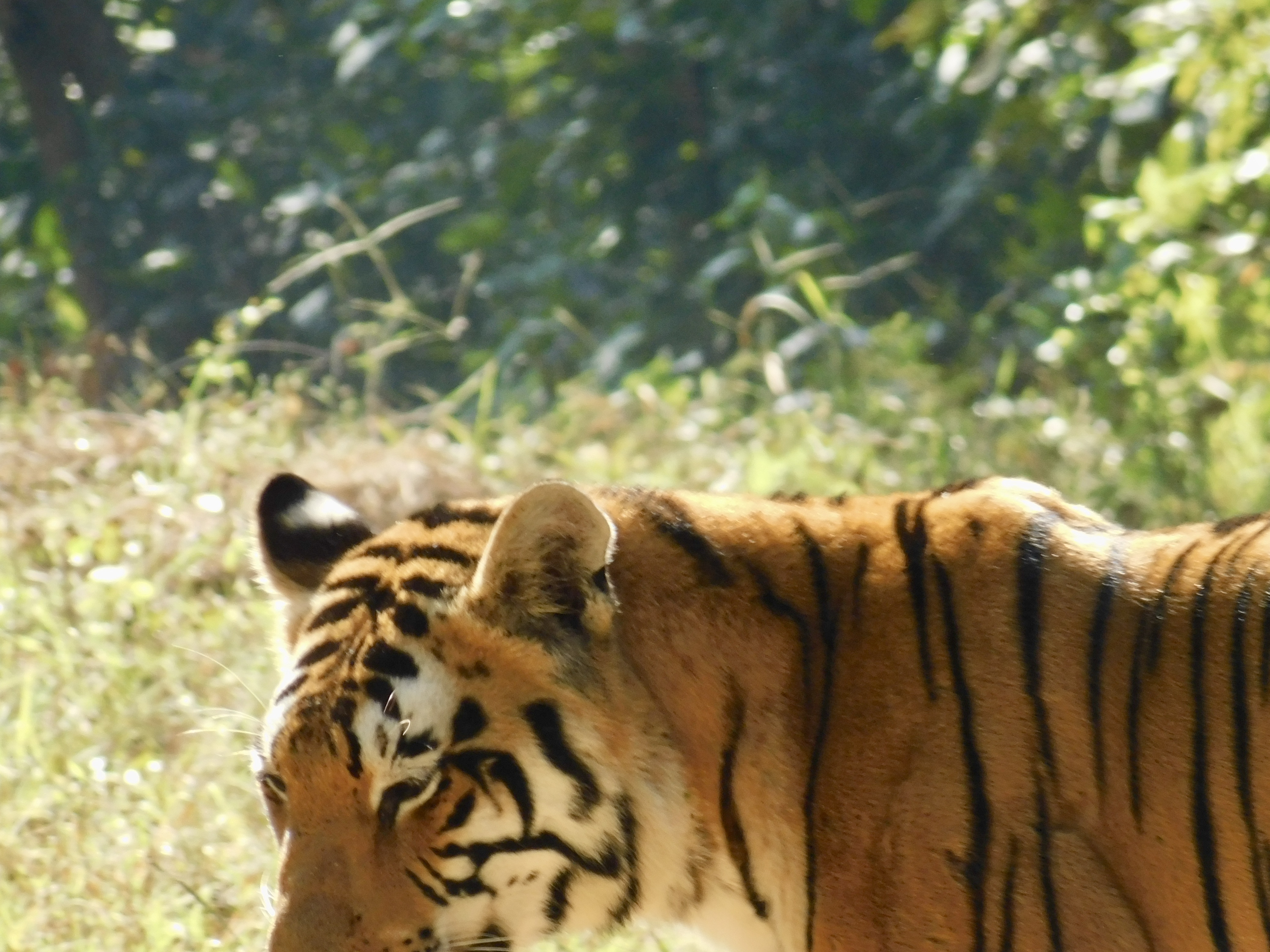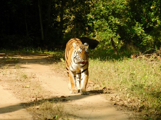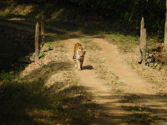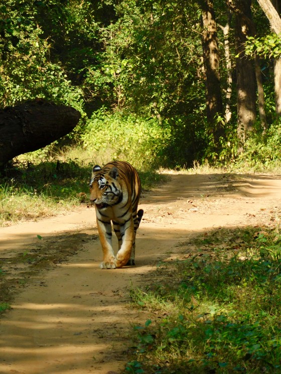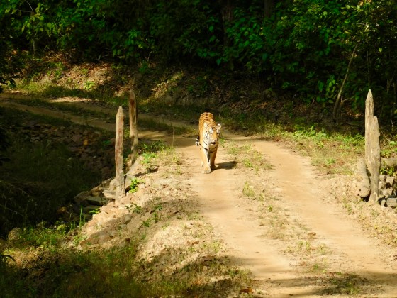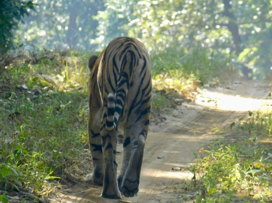 Right then, under fed conditions, we were on a predetermined glide path through the jungle to the exit gate. Our pace, gentle; the wander through the thicket, therapeutic. Zenlike was our ride out, when the guide (born and bred to be a spotter) shatters the humdrum with top drama, he shrieks Tiger on the road!!!