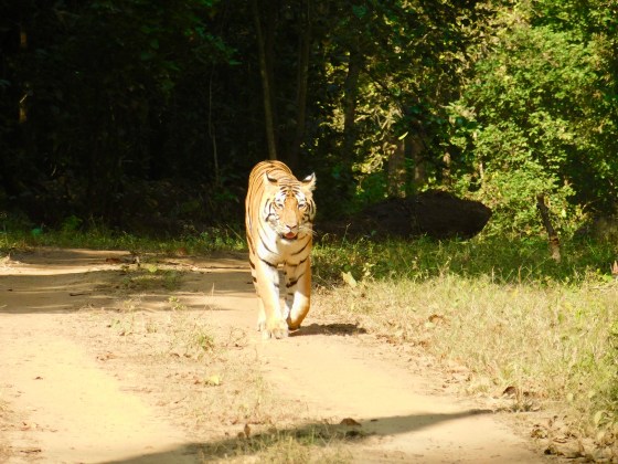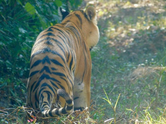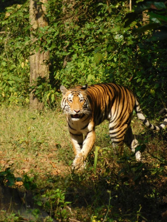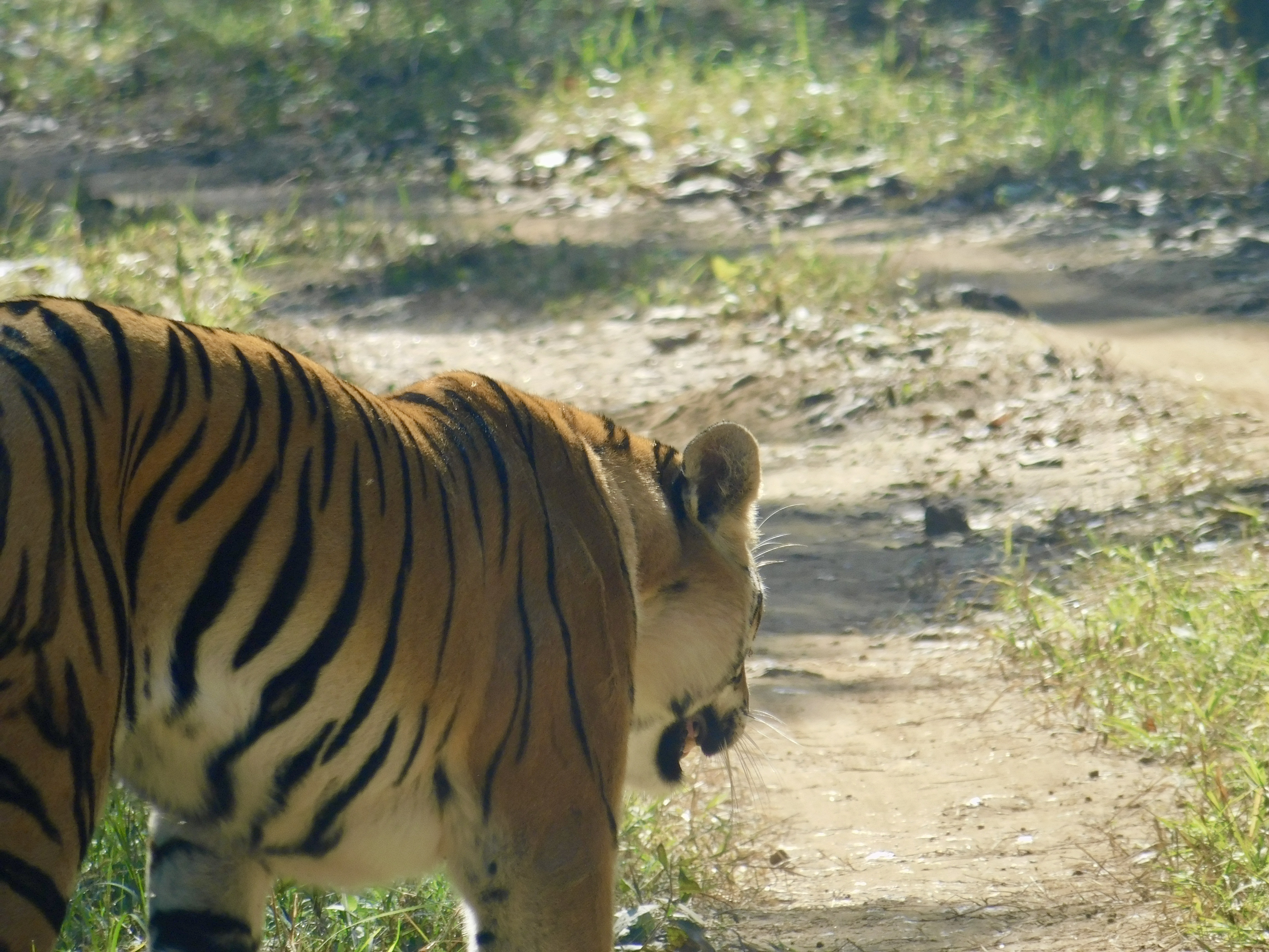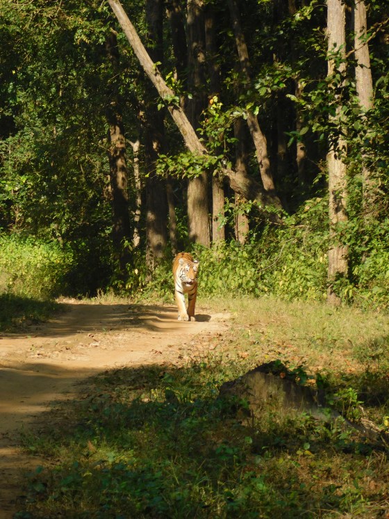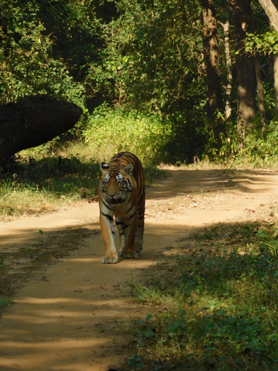 We followed it, keeping a sure distance, amazed at every move she made. She decided to saunter into the woods and all of us sighed. This is when our naturalist ever so confidently said let us manage this and he drove past her and turned off the vehicle; just as he had predicted she came back on the unpaved tan and this time we were the ones being followed. What a move by our accompanying naturalist, Yaju you Rockstar.