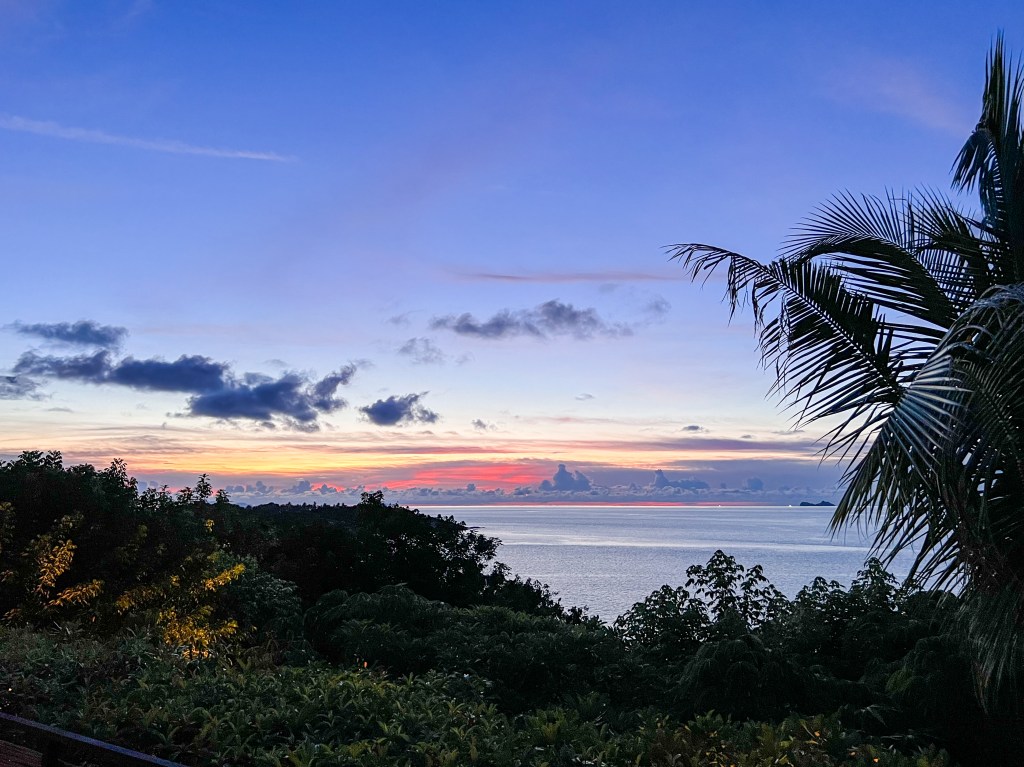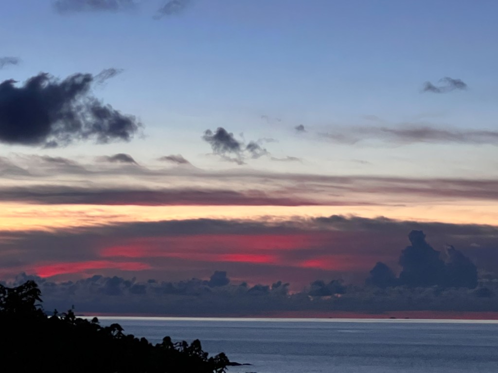 They say there are things waking up early to; if it was a place that was being referred to, surely “they” were here at dawn; at the deck of a room, on the sun rise side. At dawn, the gulf was still with a gentle misty breeze seeping through the trees, maybe, a distant bird singing. But with the ascend of the sun, the calm shifts to an unmistakable movement and reels in a brilliantly synchronised transformation. The bird songs intensified, the prettiest butterflies emerged and started their customary whirling, a purposeful breeze wiggled though the flora, the waves in the ocean emerged and started crashing into the rocks at the coast, the trails left by the boats became distinct, ruffling the still waters and the once dark patches in the gulf transformed to blots of a bright fresh green. It all came to life; all was in motion with the rising sun.