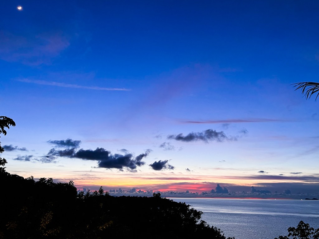 A short drive from the airport to the north eastern tip of island gets you to a green headland that overlooks the Gulf of Thailand. Amidst a thick rainforest, there is a sanctuary here called the Six Senses Samui. Upon arrival – on one side there were vertical stacks of weathered bamboos laced in front of a backdrop of a thick green, stunning; and on the other, an expansive ocean with an indigo coloured velvet sky enveloping the gulf. Over the horizon, the clouds had converged to form a layer laced with red – lava from a celestial volcano, perhaps. The outline of the red was cast with an extravagant silhouette of an orange, which would ultimately dissipate in a huge field of indigo. Add to this a perfectly clear sky with scattered stars and a moon whose luminosity got firmer as the indigo grew surer in a dusking canvas. Surreal, definitely; beautiful, most surreally.