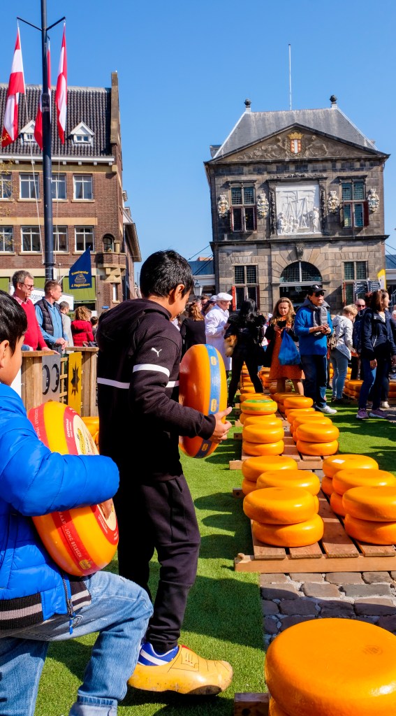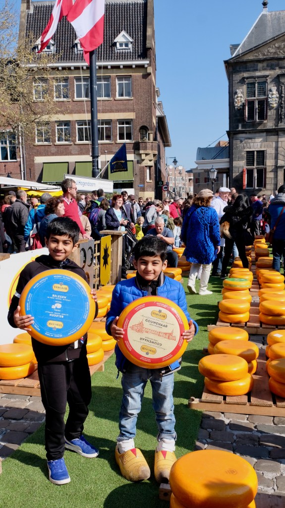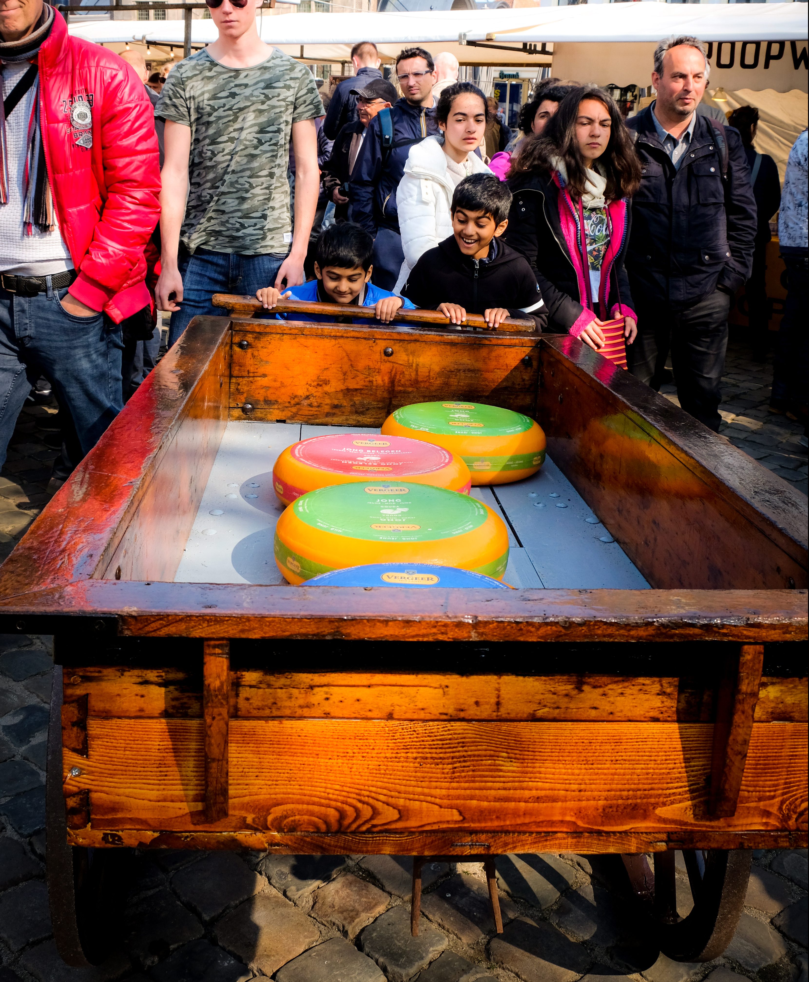 It was a very early start for us today. We drove south from the city of Amsterdam for about an hour to reach to the city of Gouda – one of the most revered cheese happens to have come from this region. Every Thursday morning from April to August there is a market held here where cheese wheels come rolling in on horse carriages and wagonettes by farmers. All this takes place in a square of the medieval city. The cheese wheels are then rolled into a nearby weighing house where they are weighed and priced. The atmosphere is enchanting to say the least; the horses, wagonettes, the cobbled stone streets and buildings add such magic to the whole setting and this is complemented by the cool breeze that ushers the smell from the baked cheesecakes and chocolate across ever corner of this magical place. DO NOT miss sampling the cheese crackers here !