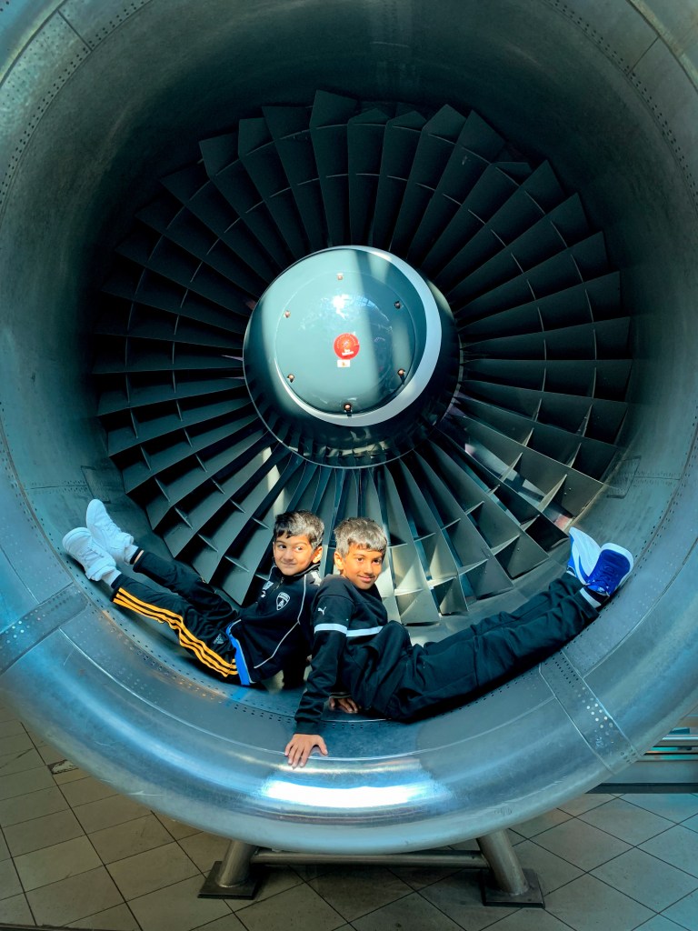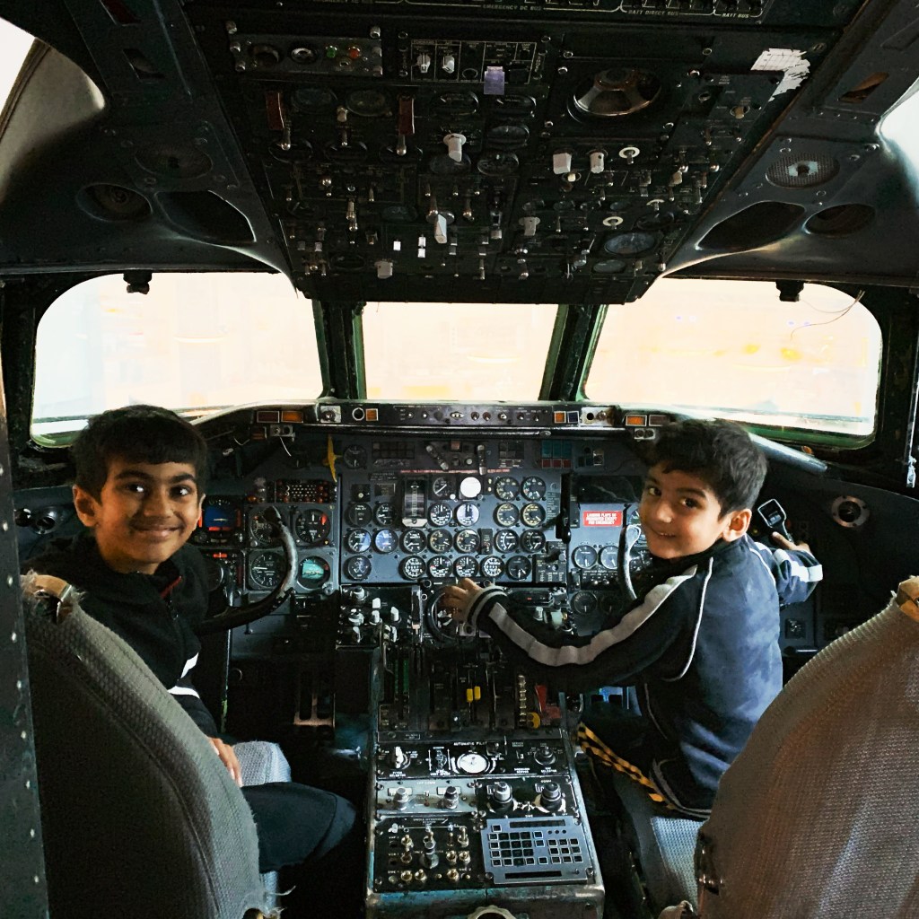 Stood in silence and witnessed a high octane role play. It was that of an A 380 being landed. The nomenclature, the adjustment of the glide path, the chatter with the ATC; all was on a loop mode; practise makes perfect remember ! was the throw back. Our pilots, severely underaged but trebling high on energy and determined to clock in the airtime. On another day, this would have been amusing but today, it was just confusing. We had just landed after an eight hour flight and wanted to head to our hotel and crash; on the other hand – the kids who were in the same space as us literarily seconds ago were now riding on a infinite surge of energy; the trigger – a replica of a propeller and a cockpit that had sneaked up on us just as we about to exit from the airport.